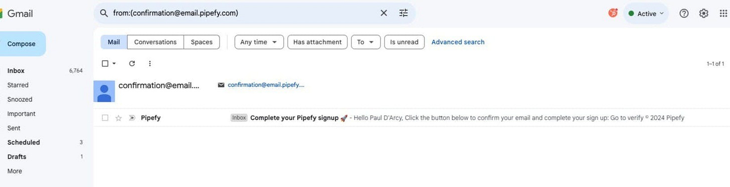 Click the Gmail verification button 👆. My inbox opens with a pre-applied Pipefy filter. This filter shows me only Pipefy emails and nothing else. 👇 #DistractionFree